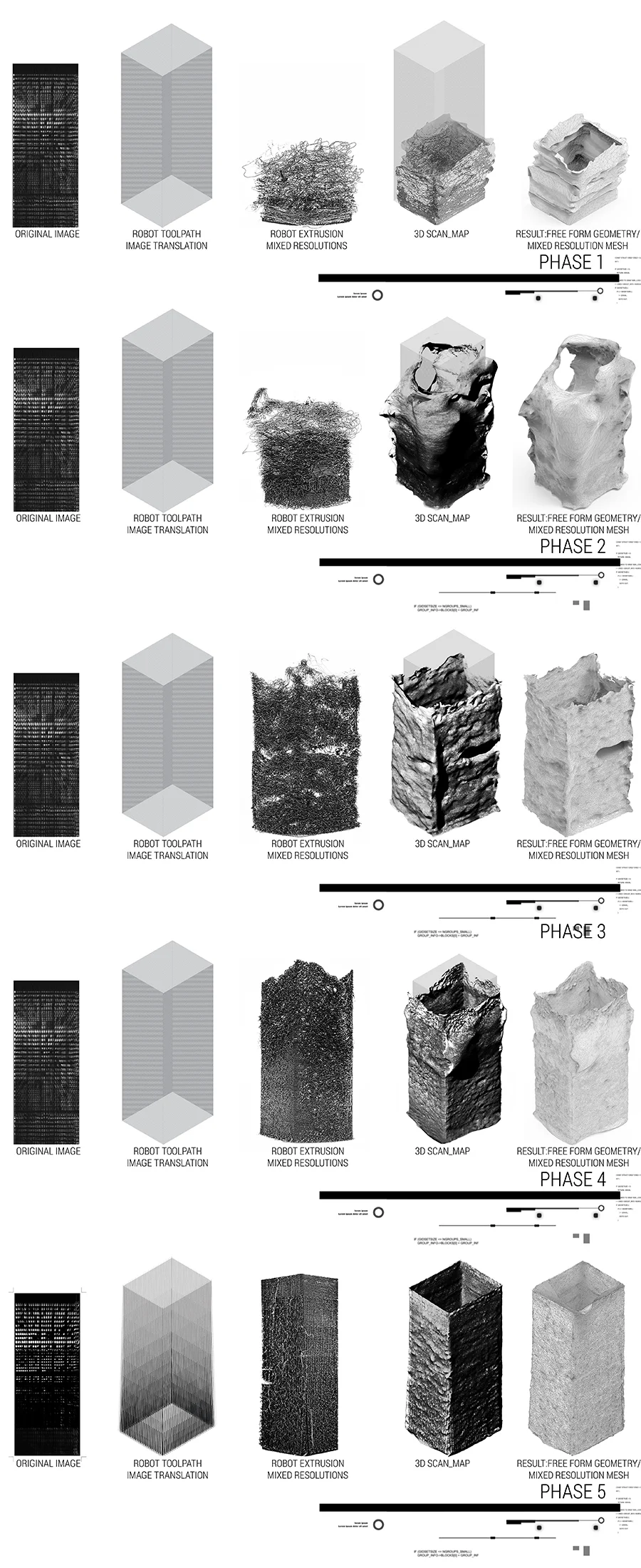 Similarly we worked on different options, using distinctive conditions of images and generated tool paths, exploring through simulations of robots various options and possibilities for extruding vertical, diagonal and interlocking geometries. As a result of this research project, extrusions were generated with very particular and unusual qualities. One of the major findings that stand out isthediversityof resolutions in the same shape, where a variety of highly detailed textures and densities areexplicitandwhichareno longer Cartesian.
