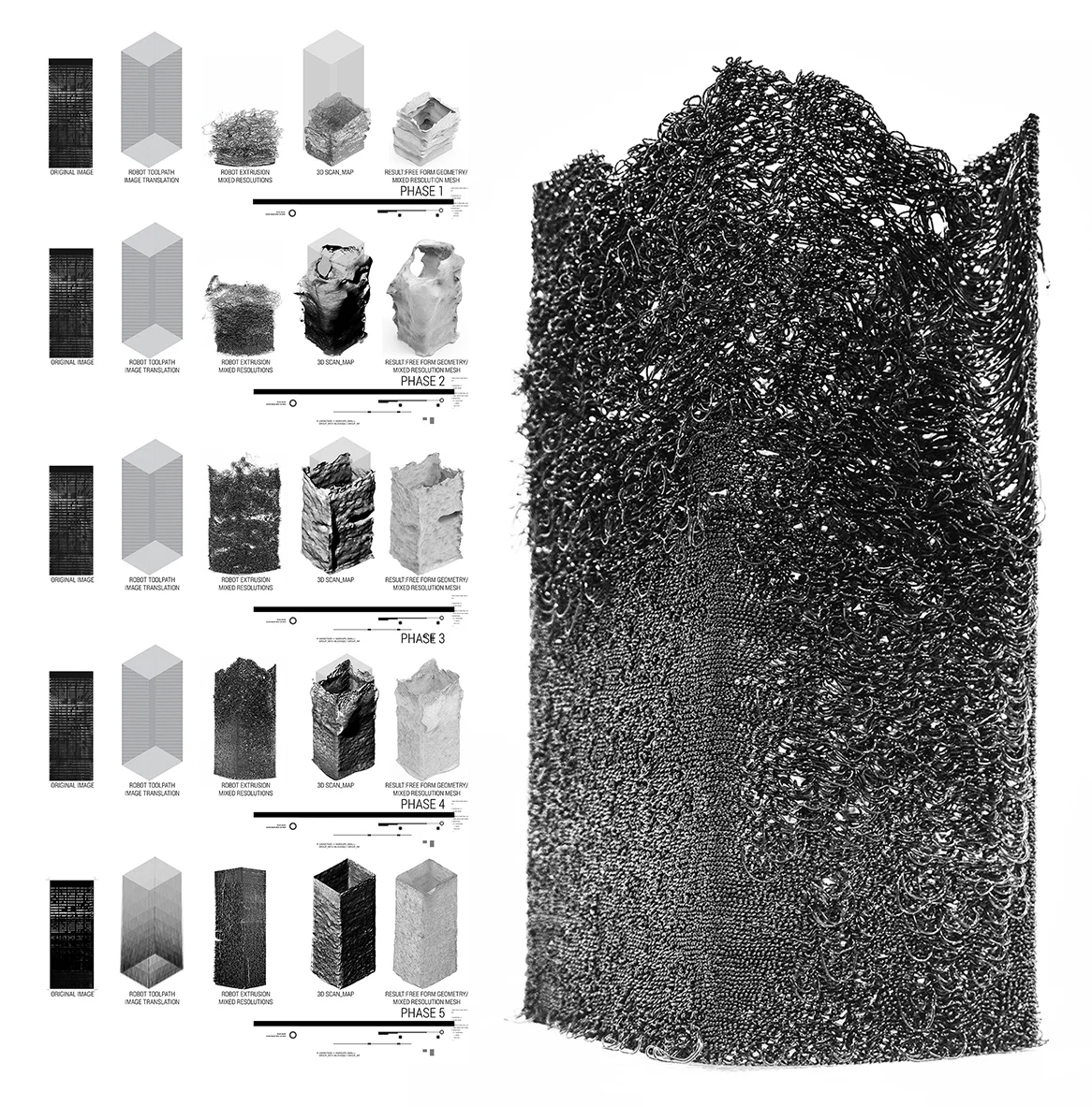 During my time at SCIArc, while on the Peter Testa Studio working on the evolution of 3D print technology. We had the opportunity to attach an extruder head to a Staubli TX40 robot to explore the possibilities of manipulating, translating, and transcoding image-based pixels into representations of different resolutions as generators of information and image in the definition of form – an ‘ontology of the image’ freed from geometrization.